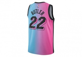 La maglia Miami Heat City Edition Swingman Nike NBA 2020-21 sfoggia un tributo al passato della divisa rivisitato attraverso le prospettive future della città. Prendendo spunto dai coloratissimi modelli precedenti, la nuova versione sfoggia sfumature orizzontali in laser fuchsia e blue gale, le colorway tipiche della squadra, e aggiunge il violetto nella palette di colori degli Heat, per un design doppio esclusivo che crea due divise in una in base alla posizione di chi osserva.